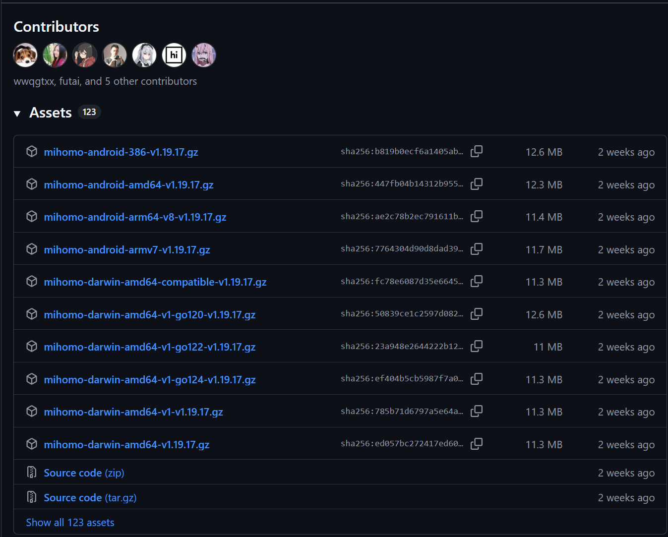 坑:这里的坑是,不知道选什么版本,mihomo 中的下载列表中,一堆 v1,v2,v3 的版本,这里的 v1,v2,v3 是根据不同年份的 cpu 做的下载区分。我开始选的是