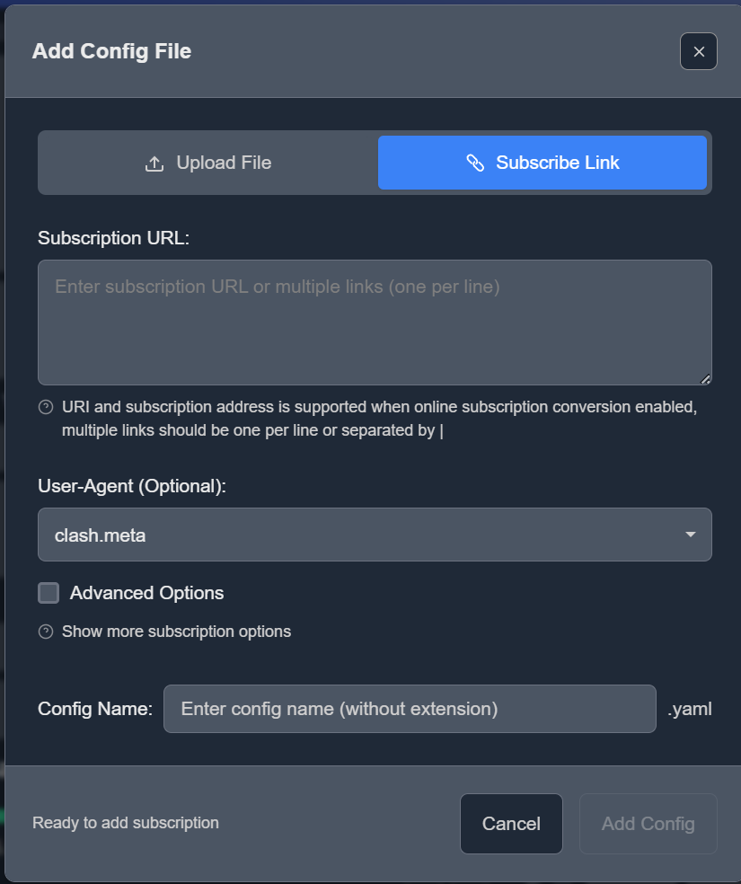 点击添加配置文件,复制与粘贴机场的配置 URL。