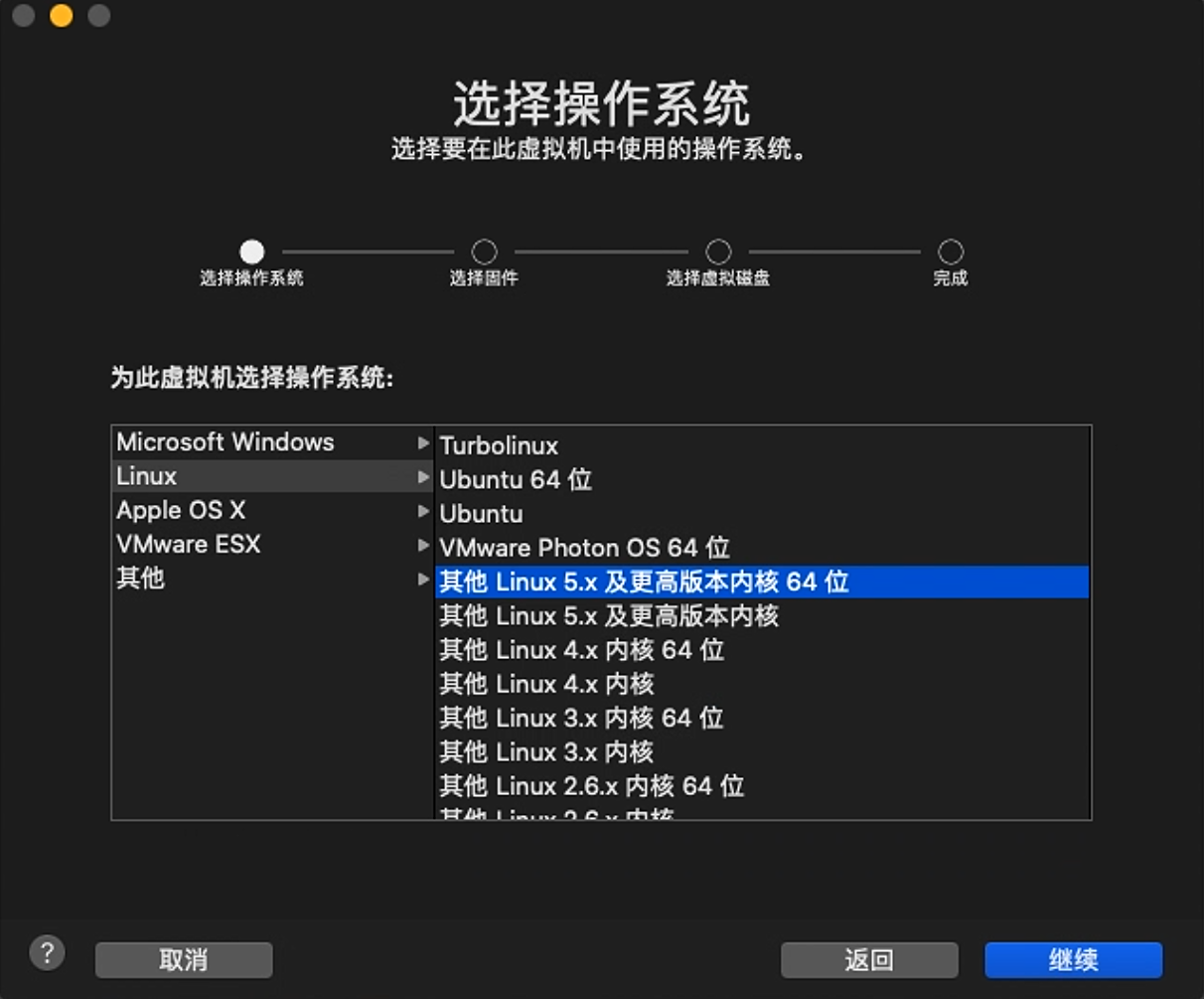 创建: 选择“其他 Linux 5.x 内核 64位”。